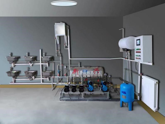 1、生活給水系統:主要有給水箱、給水泵、給水管道、壓力變送器、脈沖水表、水龍頭和淋浴頭等組成。管路采用不銹鋼管進行設計,可進行不銹鋼管的切割、安裝和通水試驗操作,通過控制系統可實現生活給水系統的變頻恒壓供水功能,實現單泵變頻控制或雙泵切換控制等功能;通過脈沖式水表可以完成用水量的計量。