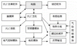 光機電一體化實訓裝置由型材導軌式實訓臺,典型機電一體化設備機械部件,PLC模塊,變頻器模塊,按鈕模塊,電源模塊,低壓電器模塊,模擬生產設備實訓模塊(包含上料機構,搬運機械手,皮帶輸送線,物件分揀等)接線端子排,各種傳感器,警示燈和氣動電磁閥等組成。整體結構采用開放式和拆裝式設計,學生可以組裝,接線,編程和調試由上料機構,搬運機械手機構,皮帶輸送線和物料分揀組成的光機電一體化設備。裝置的總體結構示意圖如圖主所示。