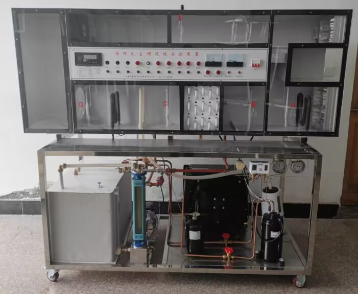 空氣熱濕處理實驗裝置為《空氣調節》課程實驗教學設備,用它可以模擬不同季節室內和室外的環境和空氣處理調節的方法,進 行集中式空調系統不同循環形式的空氣調節實驗。還可以 做變風量運行調節實驗和制冷系統的參數測定及其調節實驗。裝置具有透明風管,可直觀地觀察和測試。實驗裝置的 結構由空氣循環系統、加濕器、加熱器、冷卻器及其冷水 機組和相應的測試儀表等組成。可以實現對空氣的加熱、冷卻、加濕和除濕(表冷式和淋水式可互換使用)等處理。 在實驗中,還可以對空氣的溫度、濕度、流量進行測量,并 能對加溫器、加熱器的輸入電功率進行測定,從而可以計算各空氣處理過程中的熱量和濕量得失,以及進行熱、濕平衡 的分析。