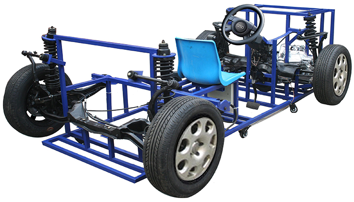 包括汽車前后懸掛系、轉向系、傳動系、手動變速器及掛檔機構、制動系等系統、安裝腳輪的可移動式臺架等組成。
