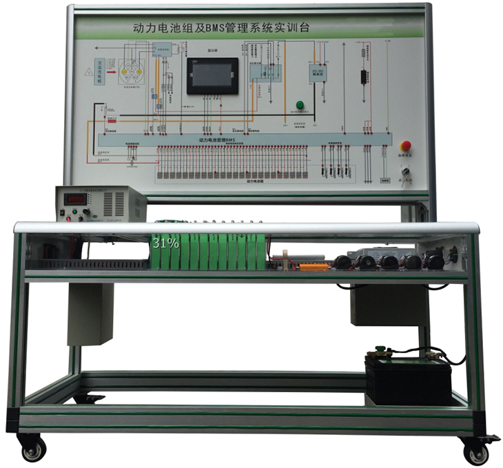 動力電池管理系統實訓臺選用新能源車輛磷酸鐵鋰 動力電池包,單體電池(3.2V20AH,共24串),帶CAN總線的一體機BMS電池管理系統,有被動均衡功能;真實地呈現了磷酸鐵鋰動力電池包核心零部件之間的連接控制關系、安裝位置和運行參數,以及高壓系統安全注意事項,并培養學員對磷酸鐵鋰動力電池包(BMS)故障分析和處理能力。適用于了解與驗證電動汽車的動力電池參數進行實時監控、故障診斷、SOC估算、短路保護、絕緣檢測、充放電控制、均衡等功能,并通過CAN總線的方式與帶CAN通訊的車載充電機進行信息交互,保障電動汽車高效、可靠、安全運行的BMS教學實訓實驗。
