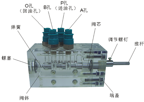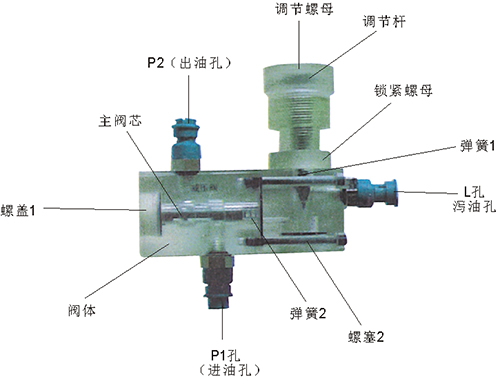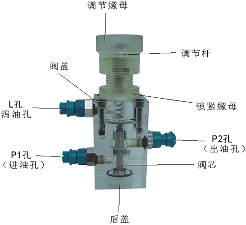 2、溢流閥結(jié)構(gòu)上參考了國產(chǎn)P-63B型低壓直動式溢流閥,其閥體閥蓋、鎖緊螺母、調(diào)節(jié)螺母、螺塞等采用了進口透明有機玻璃材料精制而成,閥芯、調(diào)節(jié)桿采用了45#中碳鋼材料。并配合彈簧,油接頭,密封圈等標準件裝配而成,通過它可明確地觀察到閥芯、彈簧、油孔等結(jié)構(gòu)及其運行過程,具有形象逼真,性能可靠等優(yōu)點。它即可作為教學模型,也可以作為液壓實驗元件進行實驗演示。