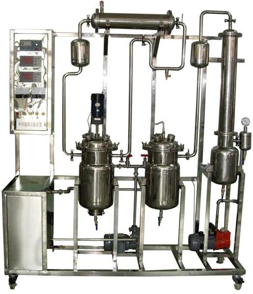 中藥提取實(shí)驗(yàn)裝置由提取罐、蒸發(fā)器、攪拌電機(jī)、列管式加熱器、冷凝器、油分器、收油器、藥液泵、貯液罐、過(guò)濾器、真空泵、調(diào)速器、數(shù)顯溫度儀、不銹鋼框架、控制屏等組成。提取罐、蒸發(fā)器配導(dǎo)熱油加熱系統(tǒng),提取罐、蒸發(fā)器頂部蒸汽出口均設(shè)置了除沫器。
