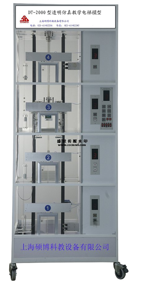 上海碩博公司的DT系列透明電梯是根據最常見的升降式電梯結構,采用鋼管焊接一體而成,表面經過磷化噴塑處理、具有良好的結構剛性。為了便于教學,電梯主要機構部件均采用透明有機材料制成 (包括:限速器、轎廂、層門及門廳立面、轎門、轎廂、機房底板、導軌支架……)為了使電梯運行控制更加精密可靠逼真,設計了與實際電梯比例縮小的鋁合金轎廂對重導軌、及轎門門機導軌、層門導軌。