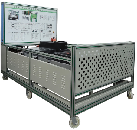(比亞迪e5 EV300純電動汽車) 鋰動力電池組、電池管理系統BMSBMS顯示屏(7寸觸摸屏)、維修開關、輔助蓄電池(12V45AH)、高壓配電箱、漏電傳感器、車載充電機、國標充電插座與充電槍、直流接觸器(包含充電繼電器、總正繼電器、總負繼電器、預充繼電器)、急停開關與電源總開關、一體化全鋁合金型材搭建的移動臺架(1500×700×1700mm ,帶自鎖腳輪裝置,帶安裝檢測端子的原理面板1448×940mm)、故障考核系統、設備操作說明書。