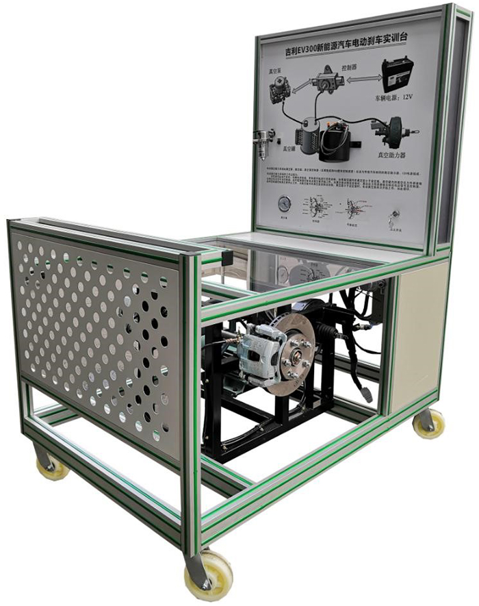 吉利EV450電動車電動真空泵(2件,1件解剖)、電動真空泵控制單元、真空壓力傳感器、剎車真空助力器、剎車總泵與踏板、剎車真空罐(2件,1件解剖)、剎車油瓶、開關電源12V30A、點火開關、真空表、壓力表(0~100kg/psi)、左右前輪液壓剎車盤總成、左右半軸總成、電機與變頻器(220V4KW1400轉電機,220V5KW變頻器)、電機傳動帶與輪盤一體化全鋁合金型材搭建的移動臺架(1500×1000×1700mm ,帶自鎖腳輪裝置,帶安裝檢測端子的原理面板948×898mm)、故障模擬與排除裝置、設備操作說明書。